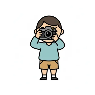 Ein lächelnder Cartoon-Junge in Latzhose hält eine Kamera und fotografiert.
