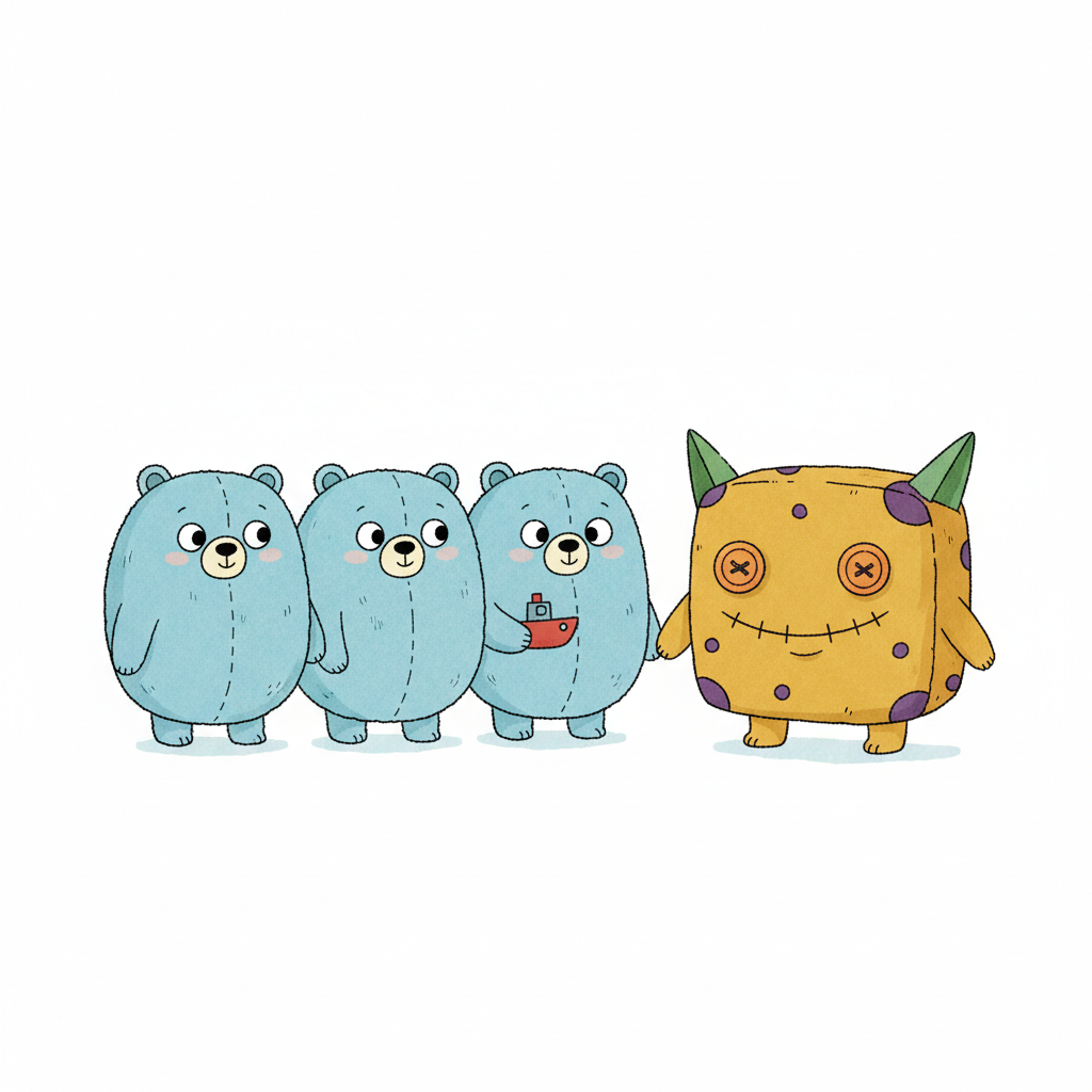 Drei blaue Teddybären, einer mit Boot, treffen auf ein gelbes Würfelmonster mit Knopfaugen.
