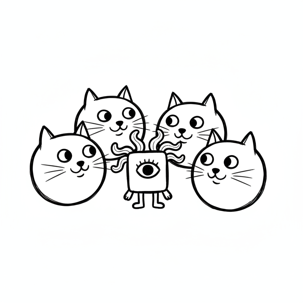 Schwarz-weiße Cartoon-Zeichnung: Vier lächelnde Katzenköpfe umringen ein einäugiges, tentakelartiges Monster.