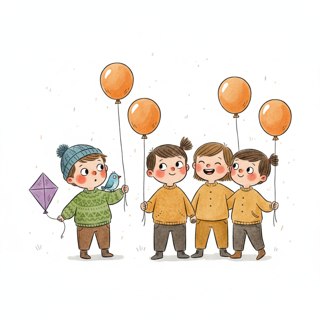 Vier Kinder spielen: Ein Junge mit Drachen und Vogel, drei Mädchen mit orangefarbenen Ballons.