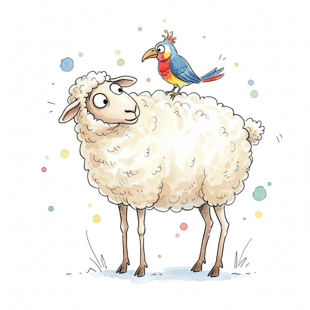 Lustiges Cartoon-Schaf mit buntem Vogel auf dem Rücken, umgeben von Farbspritzern.