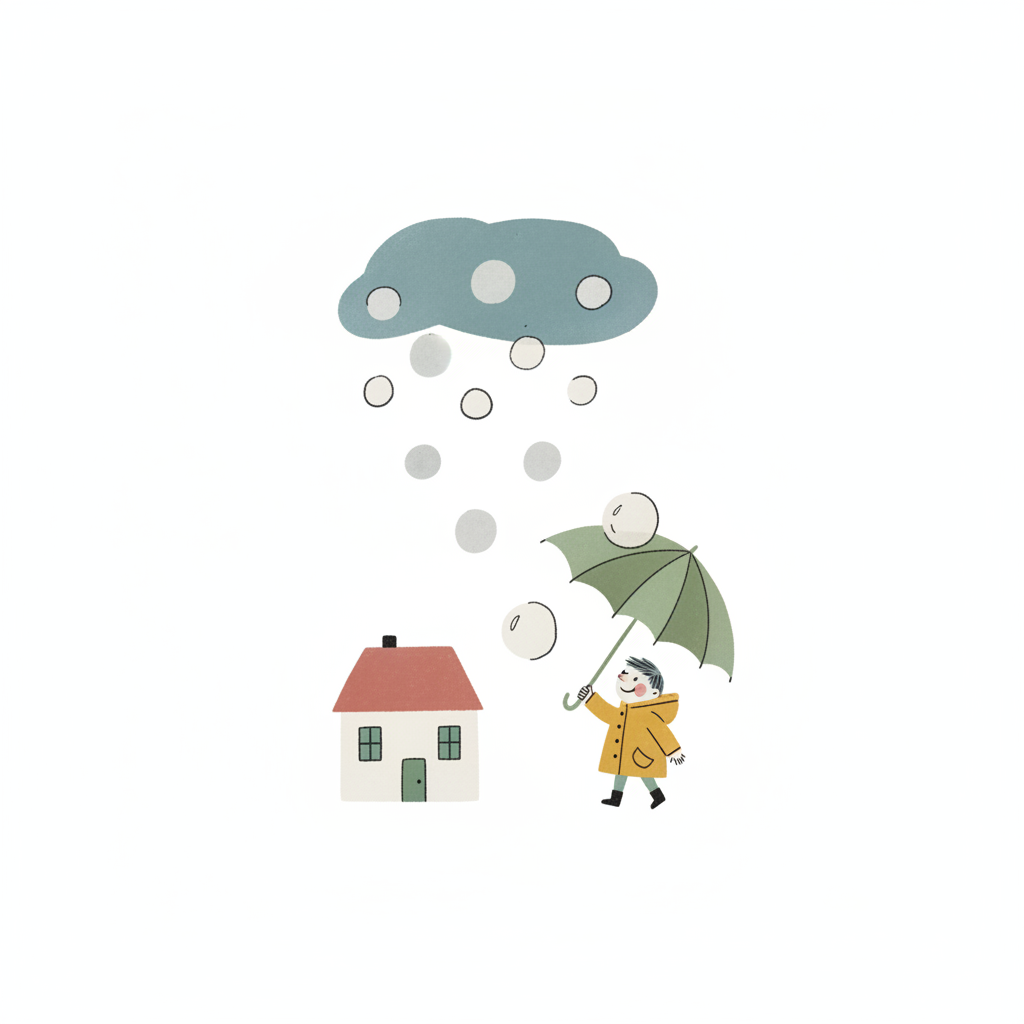 Mann mit Regenschirm unter Wolken mit Blasen, neben einem Haus.