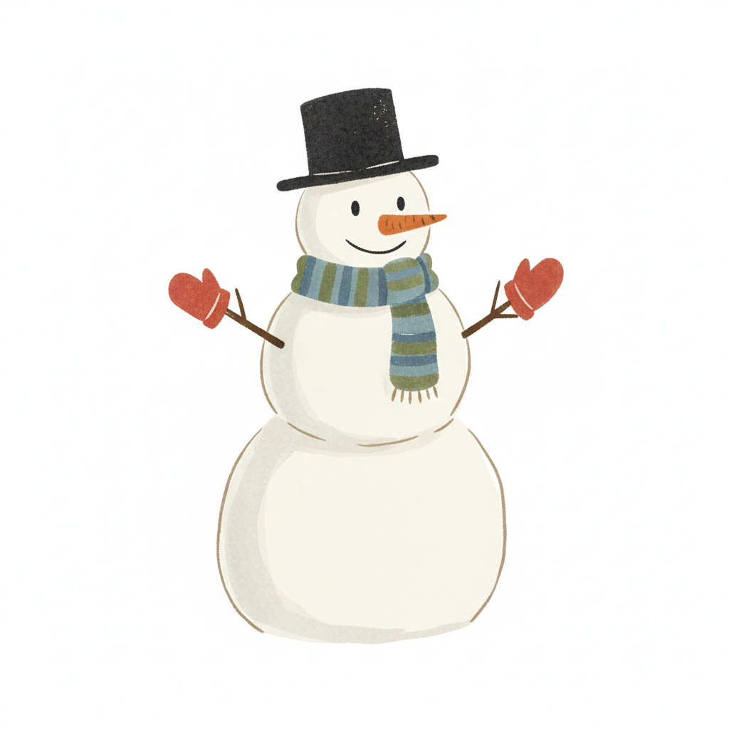 Ein fröhlicher Schneemann mit Hut, Schal und roten Handschuhen.