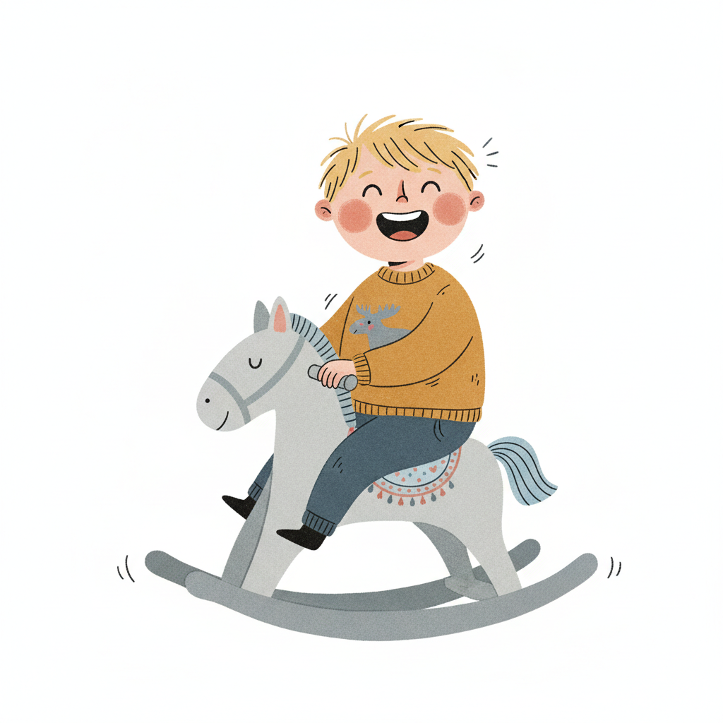 sohn junge schaukelpferd freude nordic-bilderbuch-stil