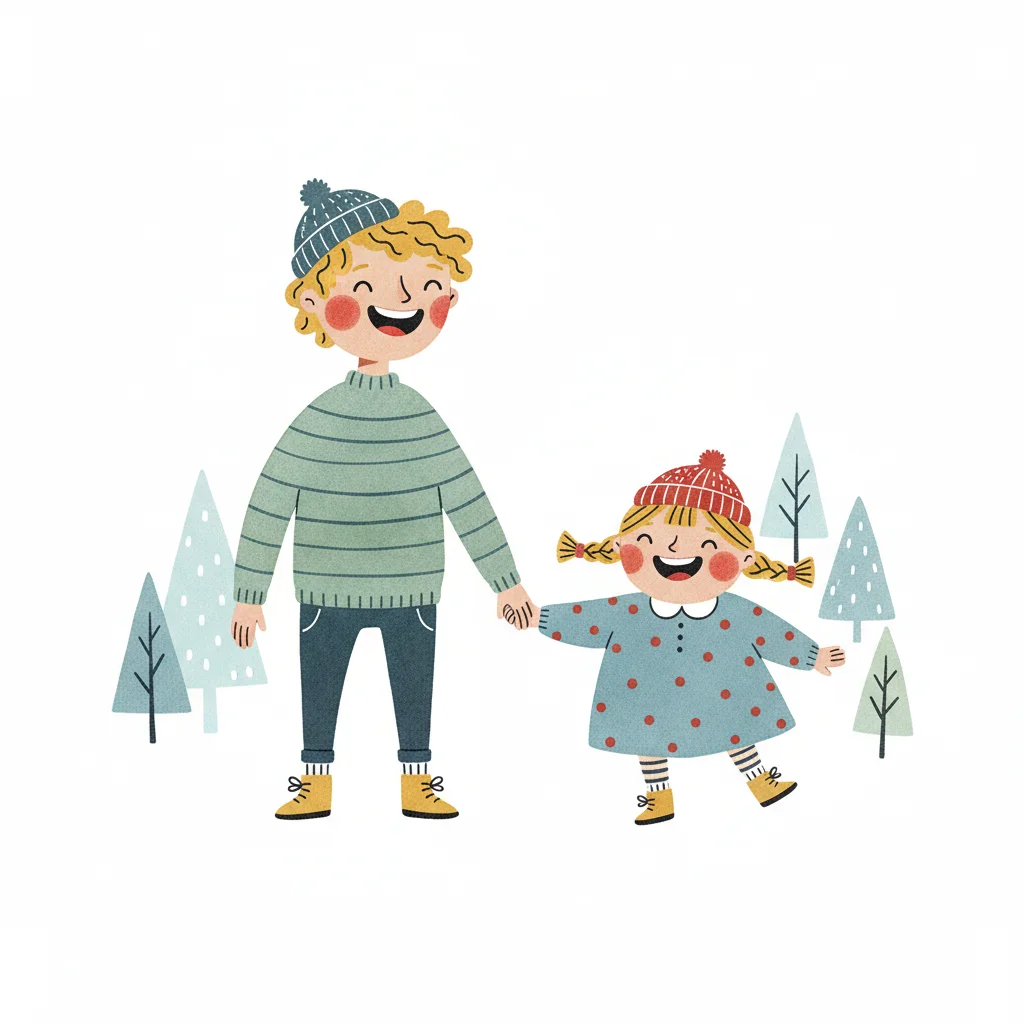 Ein fröhlicher Junge und ein Mädchen stehen Hand in Hand in einer winterlichen Landschaft.