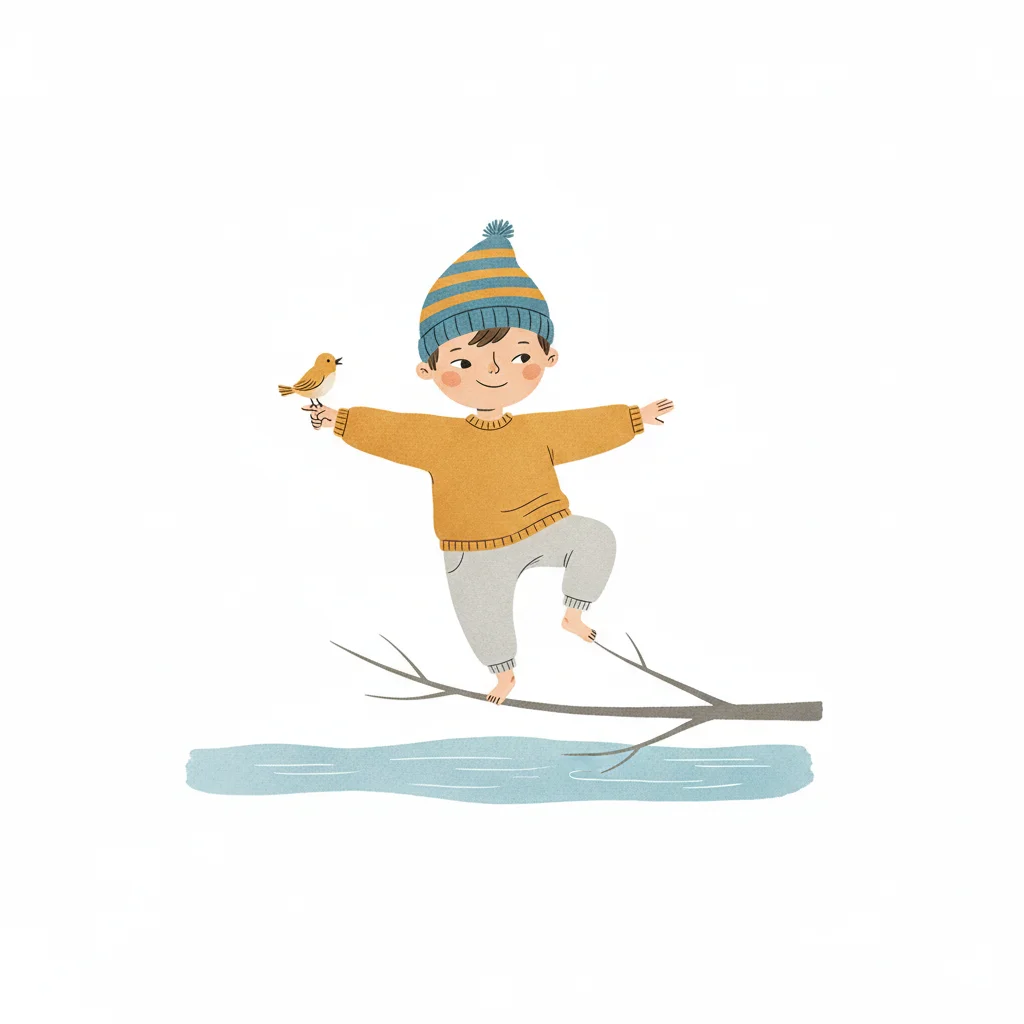 Ein Kind balanciert fröhlich auf einem Ast und hält einen kleinen Vogel.