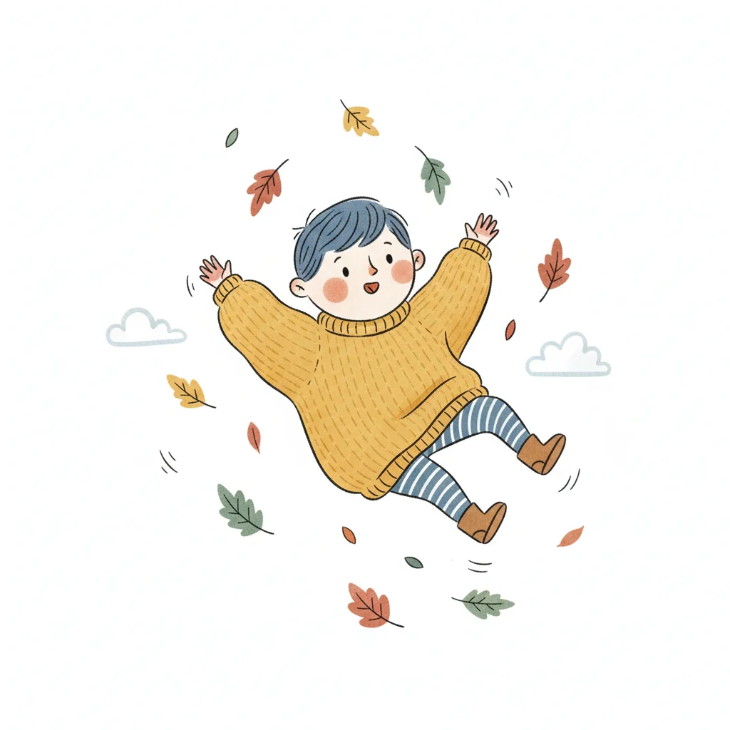 Ein fröhlicher Junge in einem großen Pullover, umgeben von fallenden Blättern.
