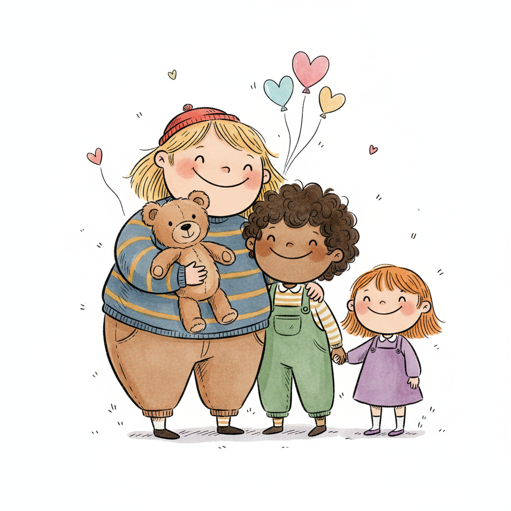 Handgezeichnete Kinderbuchillustration im modernen skandinavisch-nordischen Stil. Minimalistische, freundliche Figur mit einfachen Formen und leicht unregelmäßigen, handgezeichneten Linien. Ruhige, gedeckte Farbpalette, viel freie Fläche, reduzierte Details, sanfte Papier- oder Aquarellstruktur. Warme, ruhige, leicht humorvolle Stimmung, flächige Komposition ohne starke Perspektive, moderner nordischer Illustrationsstil, charmant und zeitlos.