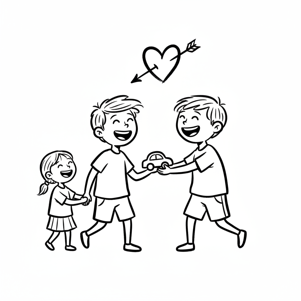 Zwei Kinder spielen verbindend mit einem Spielzeugauto, glücklich und einander zugewandt.