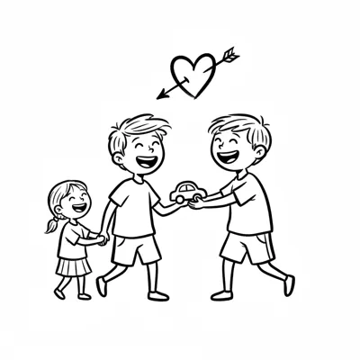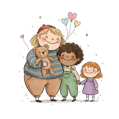Minimalistische, handgzeichnete Illustration mit deutlich handgezeichneter Wirkung. Handgezeichnete Schwarze Konturen ungleichmäßig und unregelmäßig von Hand gezeichnet. Figuren werden mit stark vereinfachten Körperformen dargestellt. Arme und Beine sind nur als einfache Linien oder Strichformen angedeutet. Flächige Farben ohne Verläufe oder Texturen, ruhige harmonische Farbpalette und reduzierte Details sorgen für eine klare, kindgerechte Darstellung. Saubere, übersichtliche Komposition mit rein weißem Hintergrund.
