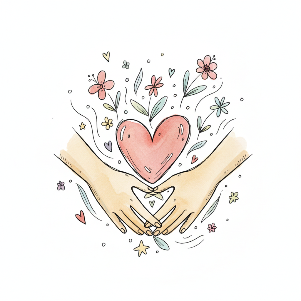 Hände halten ein Herz umgeben von Blumen und kleinen Herzen.