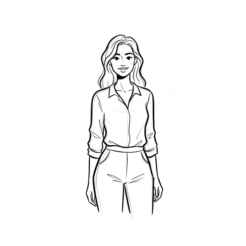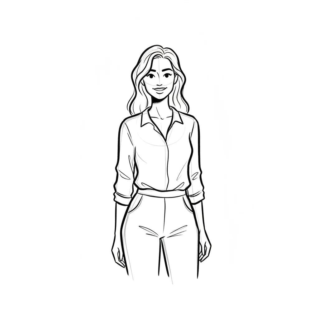 Eine lächelnde Frau in eleganter Kleidung steht aufrecht.