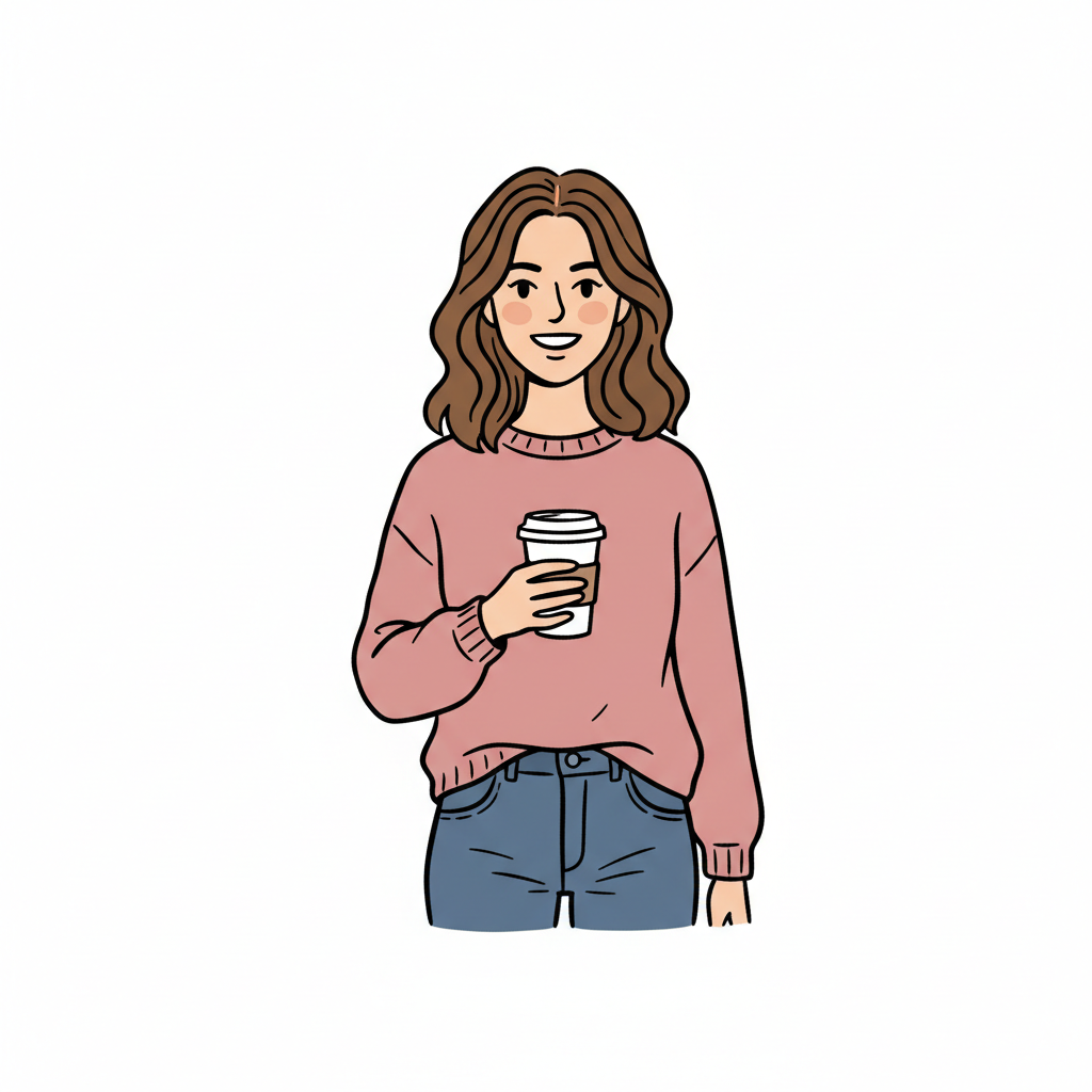 Handgezeichnete Kinderbuchillustration im modernen skandinavisch-nordischen Stil. Minimalistische, freundliche Figur mit einfachen Formen und leicht unregelmäßigen, handgezeichneten Linien. Ruhige, gedeckte Farbpalette, viel freie Fläche, reduzierte Details, sanfte Papier- oder Aquarellstruktur. Warme, ruhige, leicht humorvolle Stimmung, flächige Komposition ohne starke Perspektive, moderner nordischer Illustrationsstil, charmant und zeitlos.
