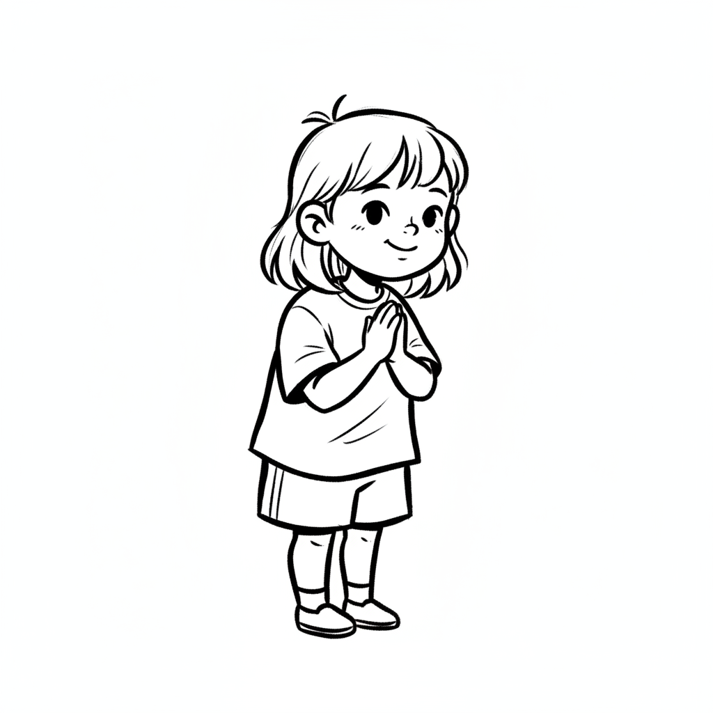 Ein süßes Kind mit gefalteten Händen und Herzsymbol im Sprechblasen.