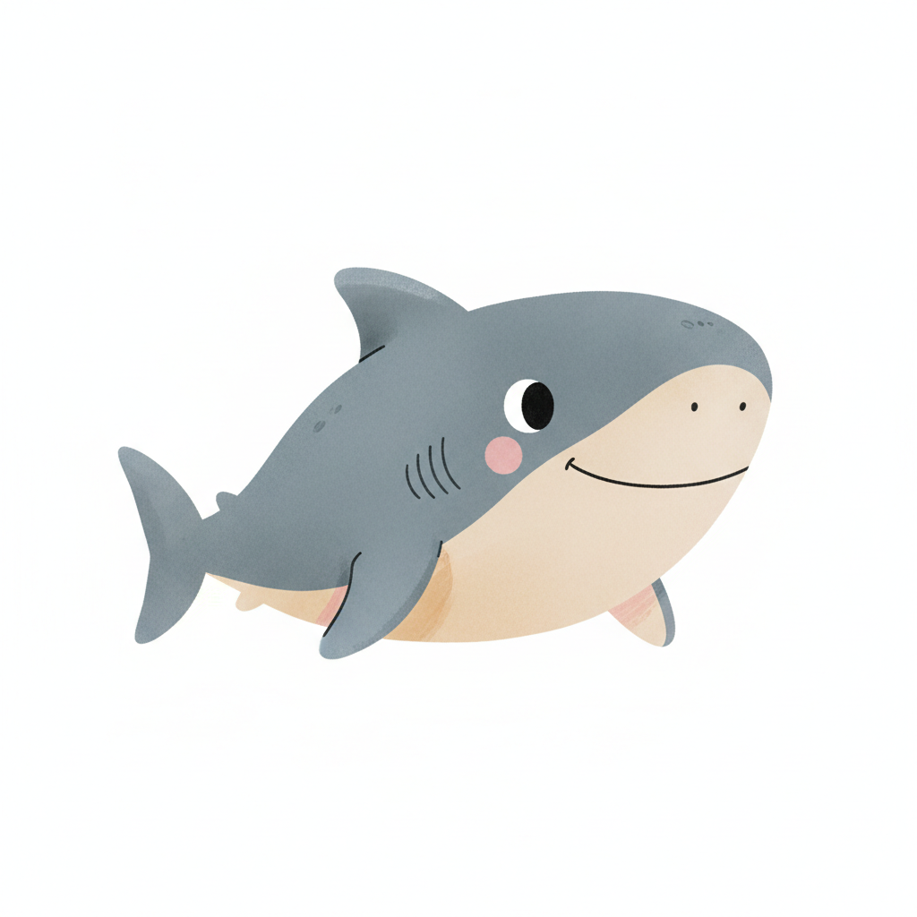 Lustiger, cartoonartiger Hai mit freundlichem Gesichtsausdruck.