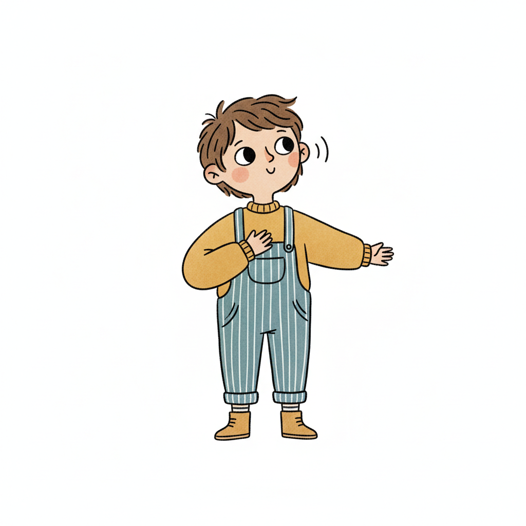 Handgezeichnete Kinderbuchillustration im modernen skandinavisch-nordischen Stil. Minimalistische, freundliche Figur mit einfachen Formen und leicht unregelmäßigen, handgezeichneten Linien. Ruhige, gedeckte Farbpalette, viel freie Fläche, reduzierte Details, sanfte Papier- oder Aquarellstruktur. Warme, ruhige, leicht humorvolle Stimmung, flächige Komposition ohne starke Perspektive, moderner nordischer Illustrationsstil, charmant und zeitlos.