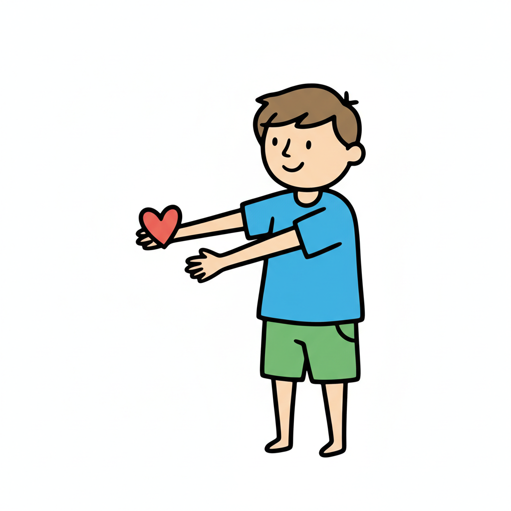 Ein Junge reicht ein rotes Herz mit einem Lächeln.