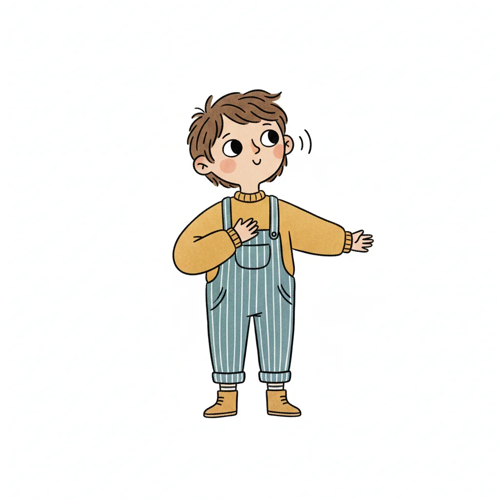 Ein Junge in Latzhose und Pullover winkt mit einem freundlichen Lächeln.