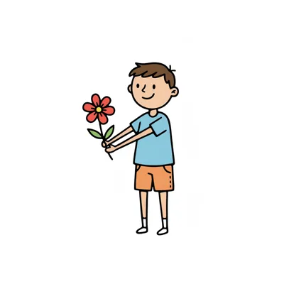 Junge hält eine bunte Blume in der Hand und lächelt.