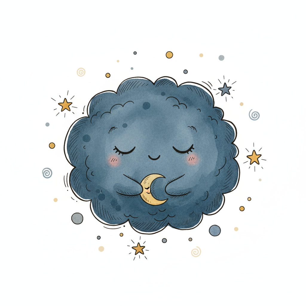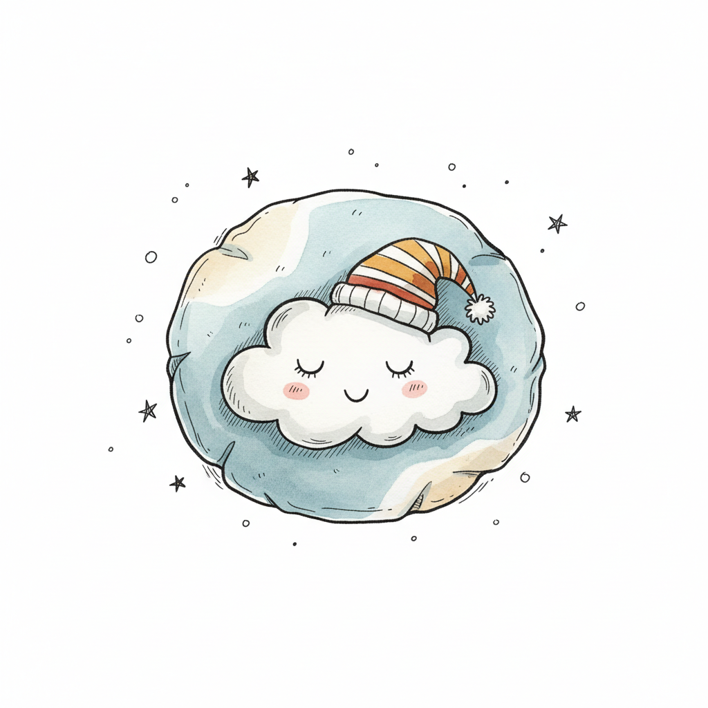 Eine süße Wolke mit Schlafmütze schlummert friedlich auf einem blauen Kissen, umgeben von Sternen.