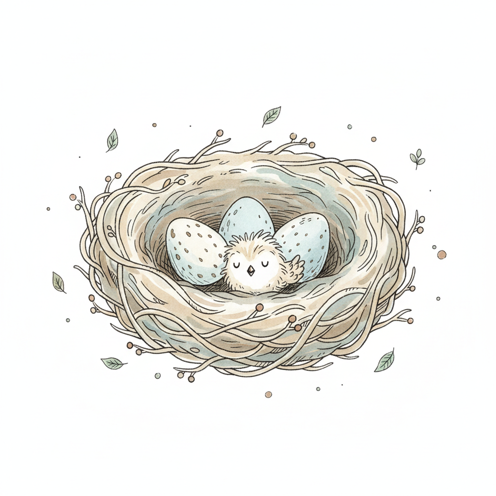 Ein flauschiges Küken ruht friedlich in einem Vogelnest mit drei Eiern. Aquarell-Stil.