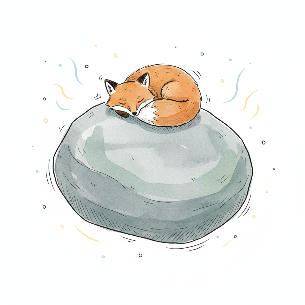 Ein süßer Fuchs schläft friedlich zusammengerollt auf einem großen, runden Stein. Aquarellstil.