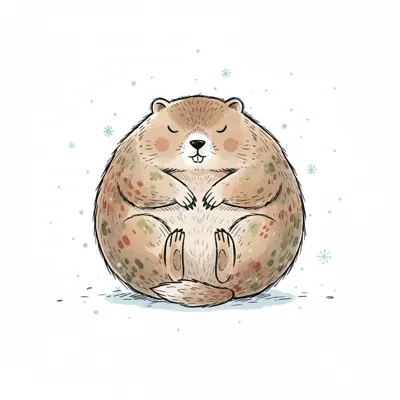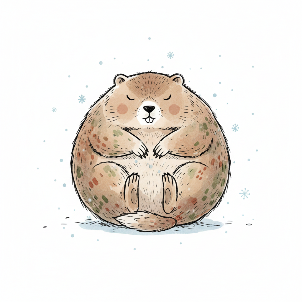 Niedliches, rundes Murmeltier sitzt friedlich mit geschlossenen Augen im Schnee.