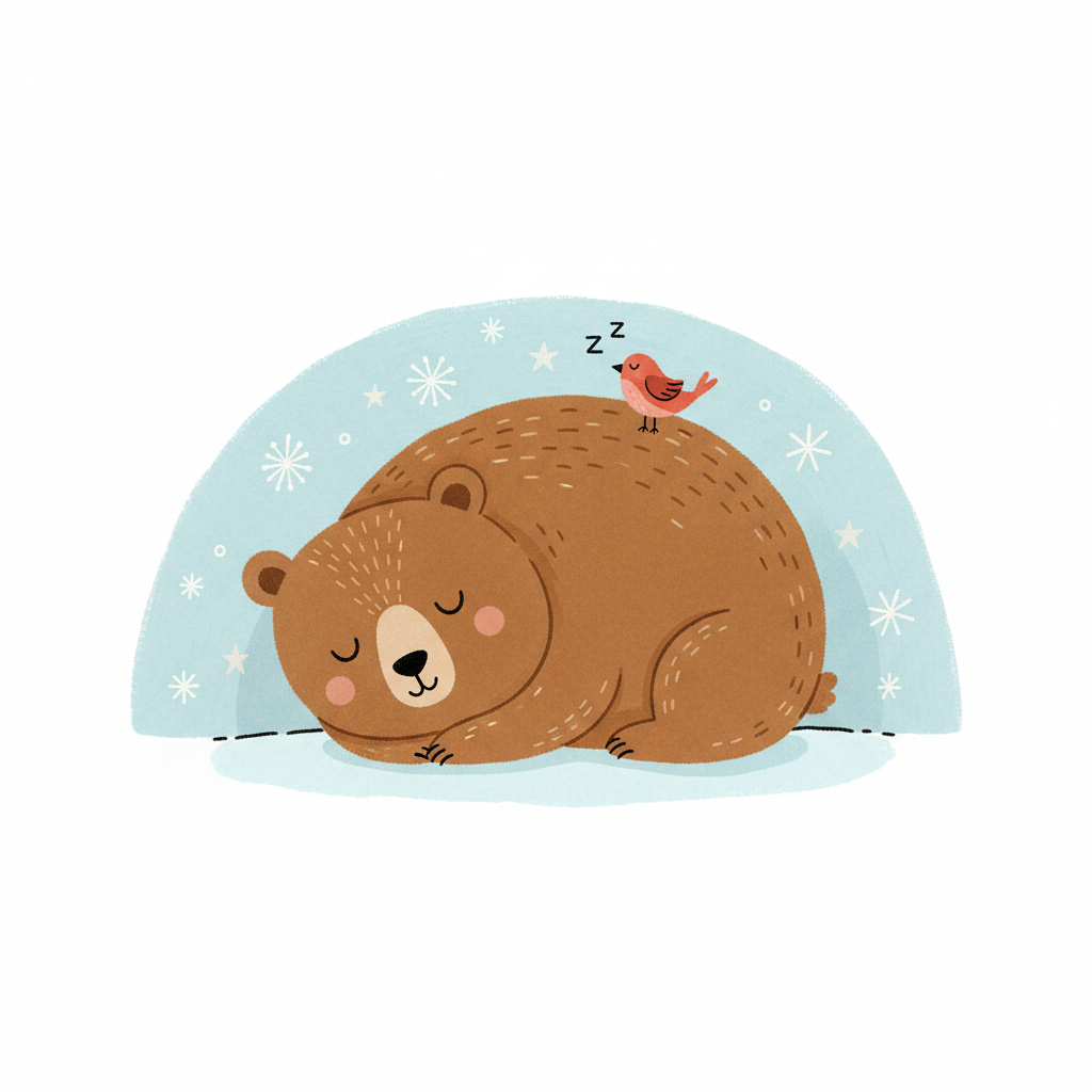 Ein süßer Bär schläft friedlich, während ein kleiner Vogel auf seinem Rücken ruht, umgeben von Schneeflocken.