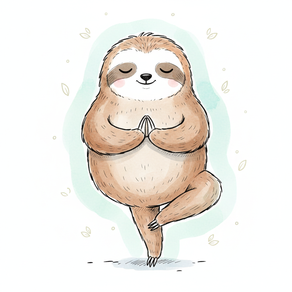 Niedliches Faultier macht Yoga in der Baum-Pose, mit geschlossenen Augen und friedlichem Ausdruck.