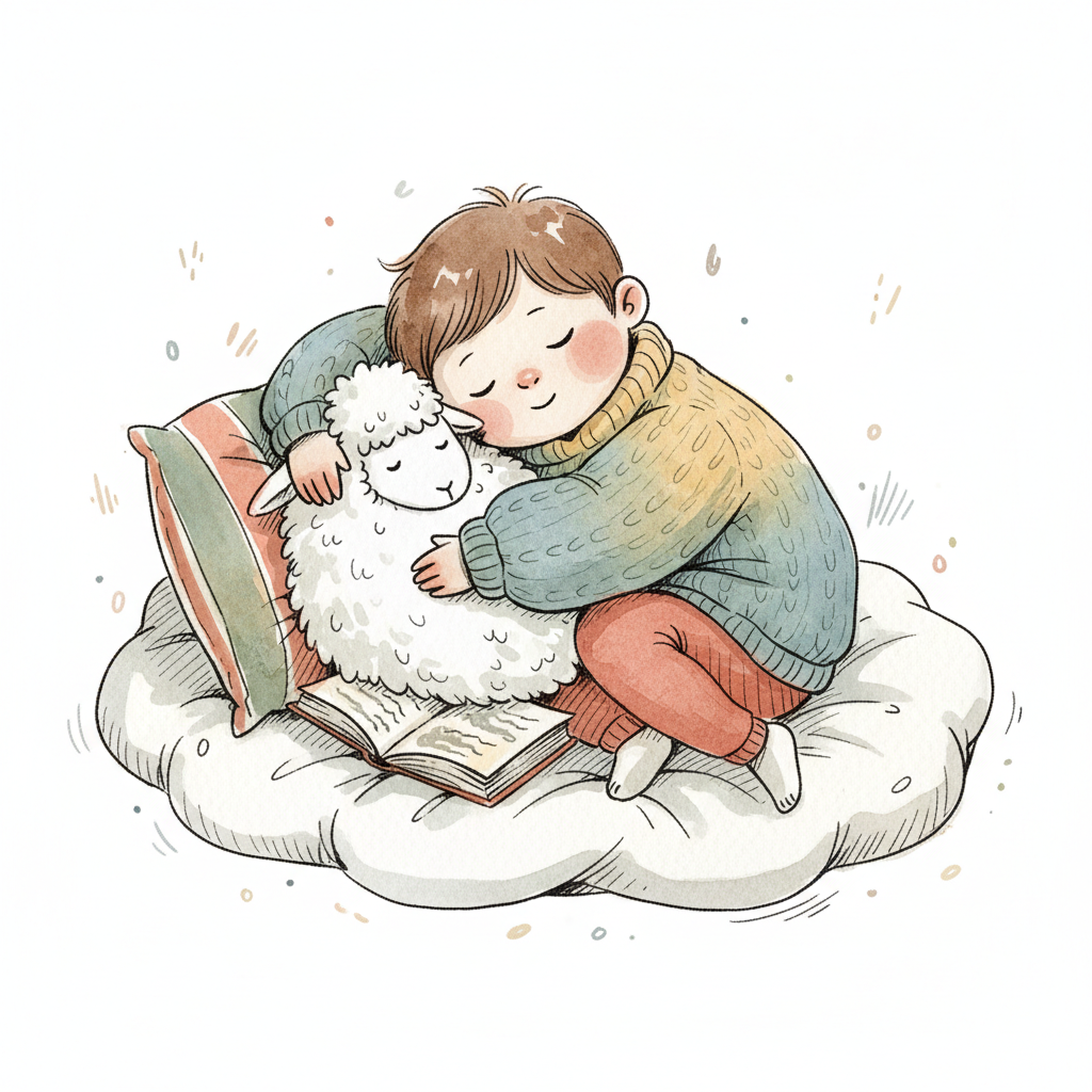 Ein Kind schläft friedlich, ein Schaf umarmend, auf einer Wolke mit einem Buch.