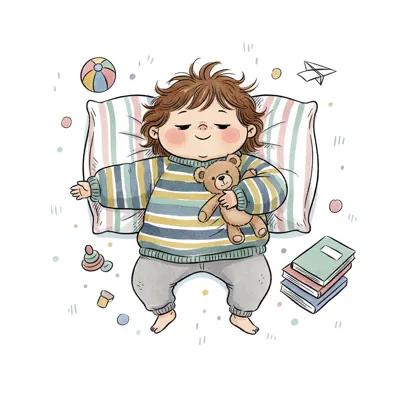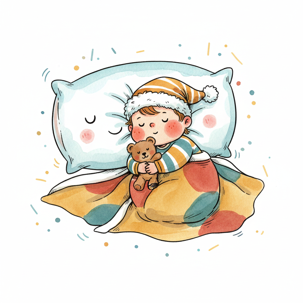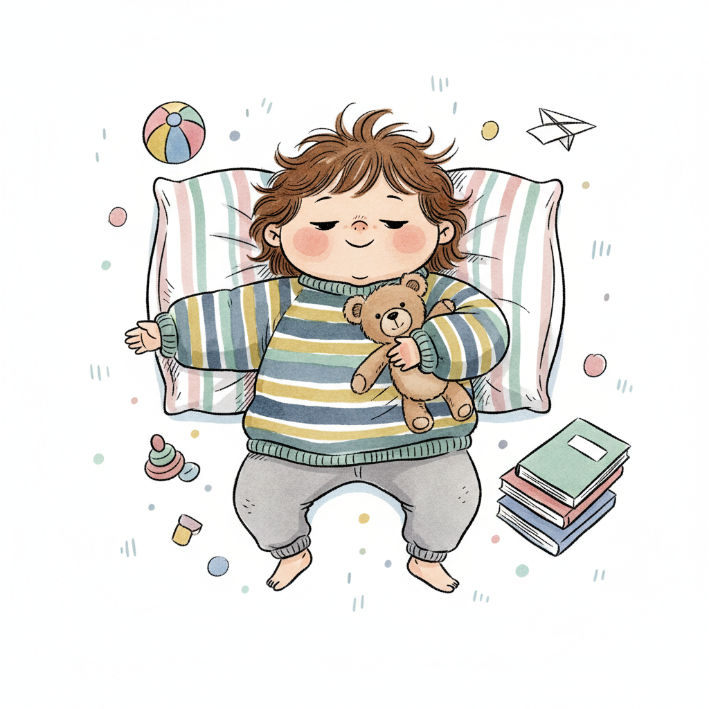 Niedliches Kind schläft friedlich mit Teddybär auf gestreiftem Kissen, umgeben von Spielzeug.