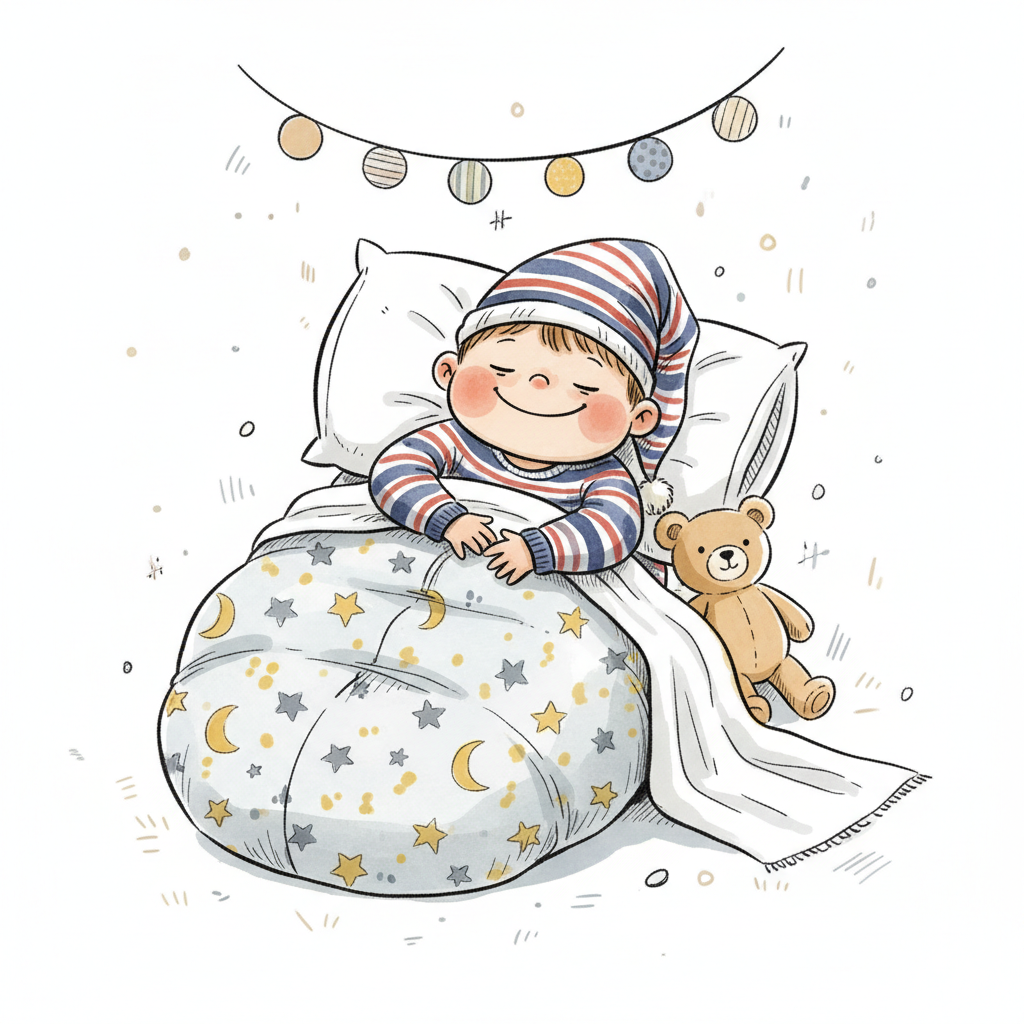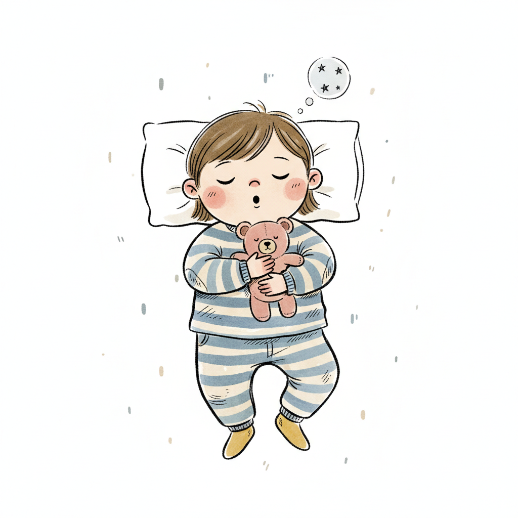 Ein süßes Cartoon-Kind schläft friedlich in einem Schlafsack mit Sternen und Monden, neben einem Teddybär.
