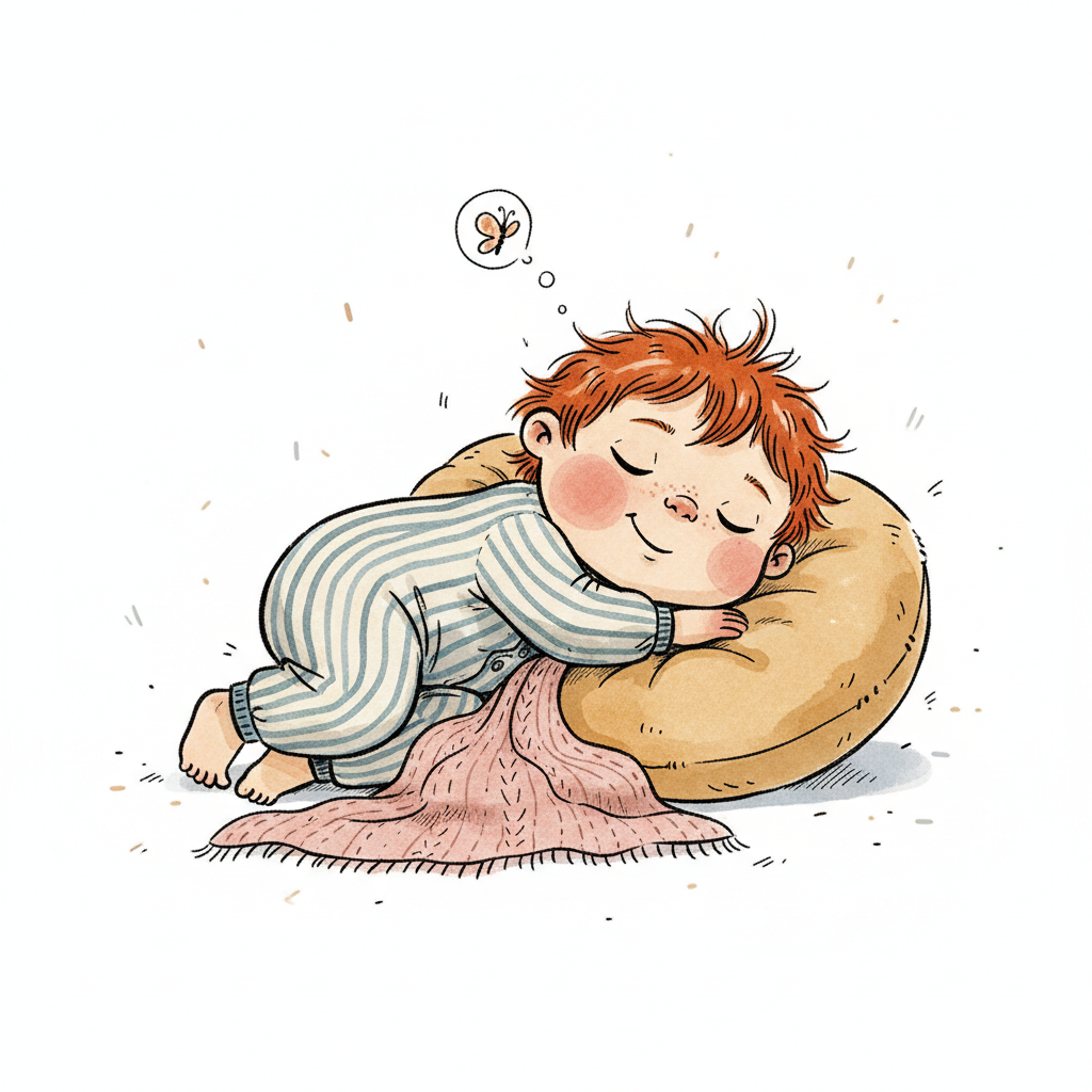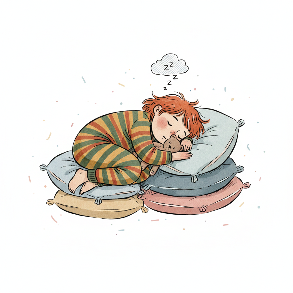 Friedlich schlafendes Kind mit rotem Haar und Teddybär auf einem Stapel bunter Kissen.