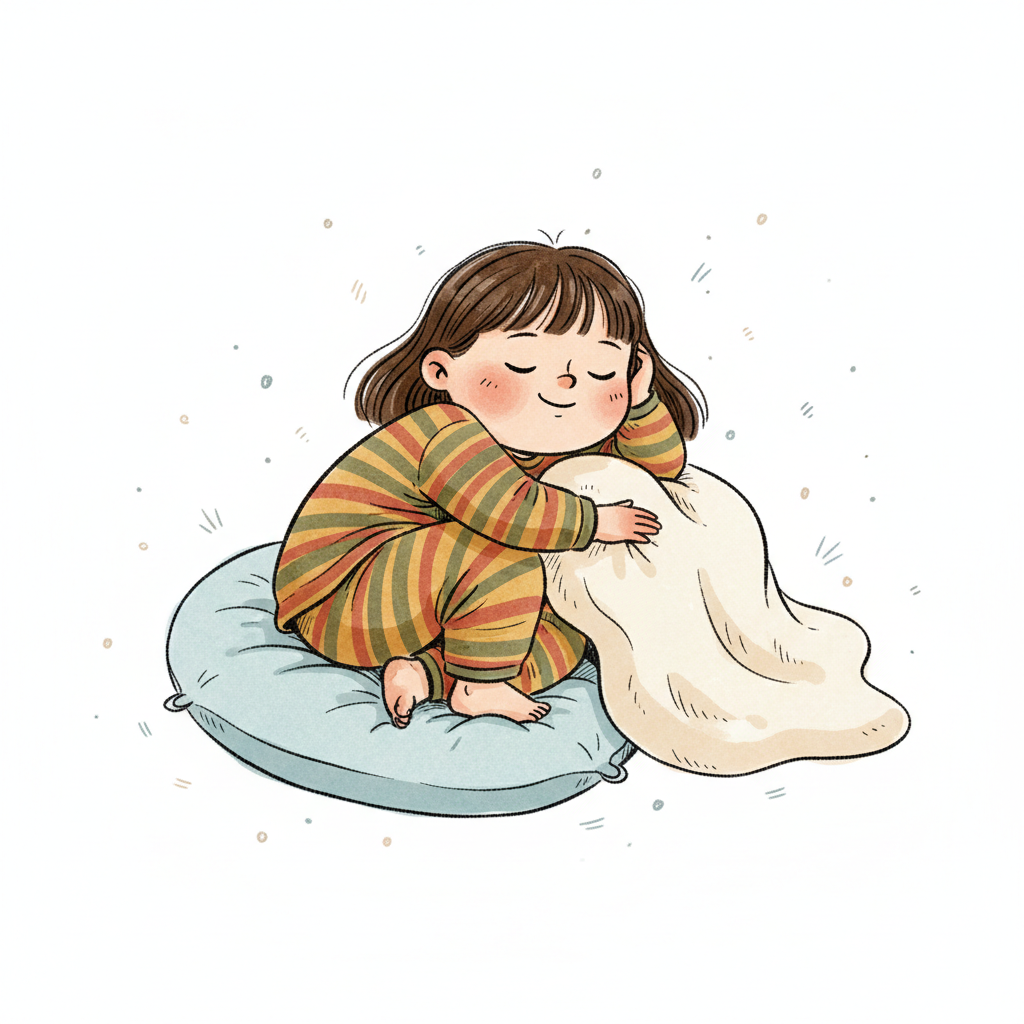 Niedliches Cartoon-Mädchen in gestreiftem Schlafanzug schläft friedlich auf einem Kissen.