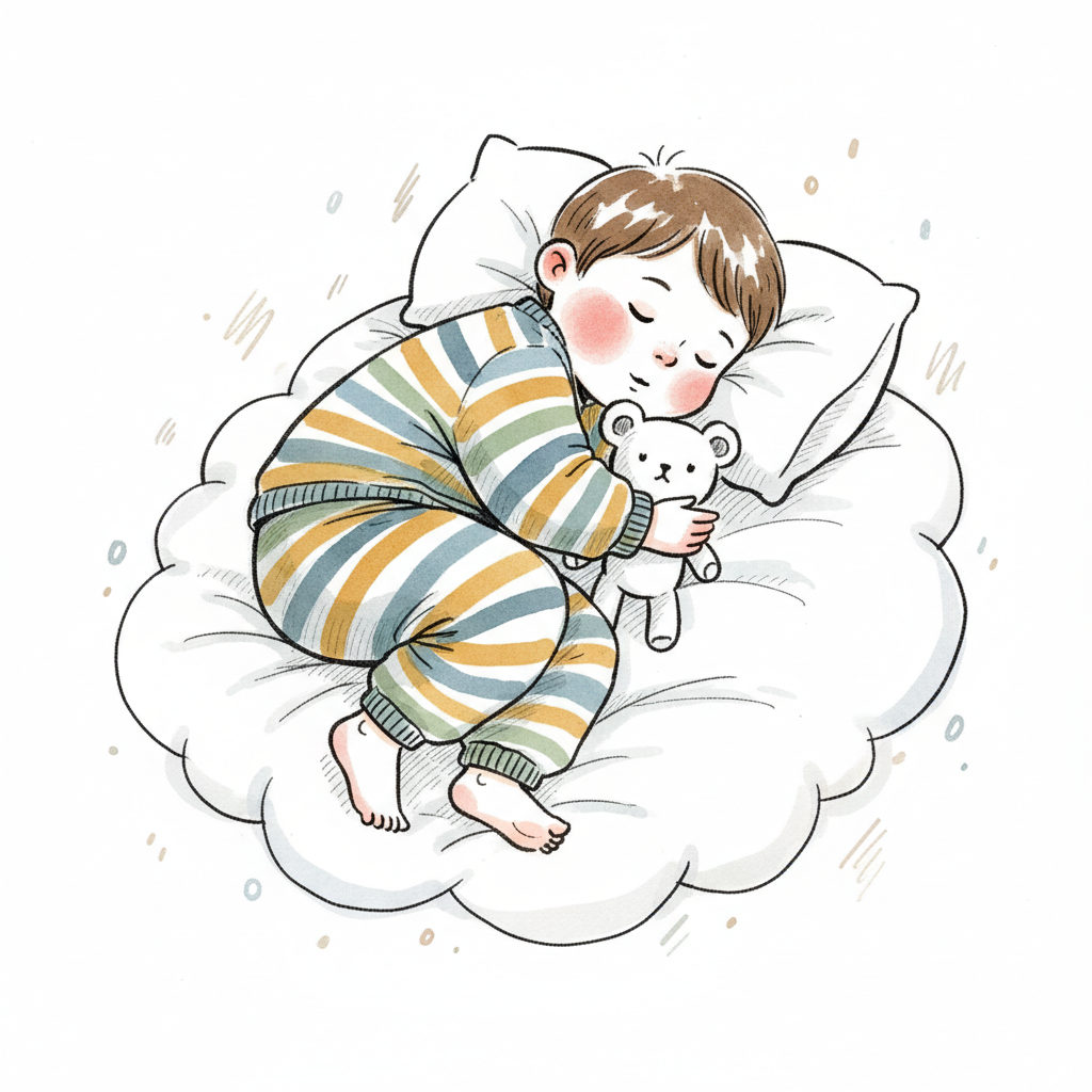 Ein süßes Kind schläft friedlich in gestreiftem Pyjama auf einer Wolke, einen Teddybär umarmend.