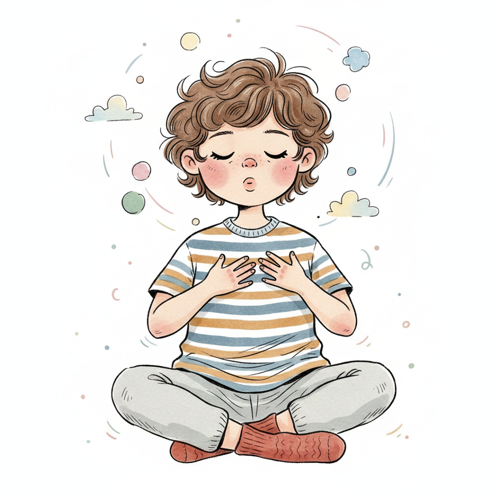 Friedlich meditierendes Kind mit geschlossenen Augen und Händen auf der Brust, umgeben von sanften Farben.