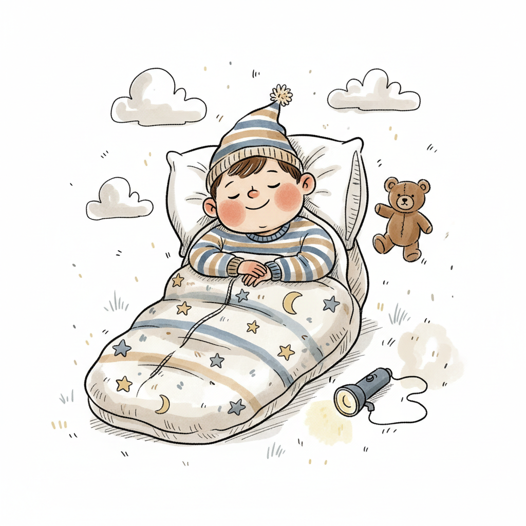 Niedliches Kind schläft friedlich im Schlafsack mit Teddybär und Taschenlampe unter Wolken.