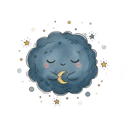 Süße blaue Wolke schläft friedlich und hält einen kleinen Mond, umgeben von funkelnden Sternen.