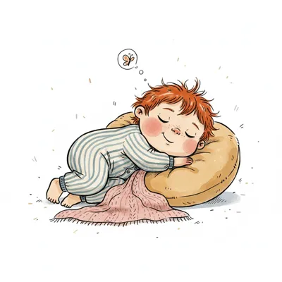 Ein süßes Baby mit roten Haaren schläft friedlich in gestreiften Pyjamas und träumt von einem Schmetterling.