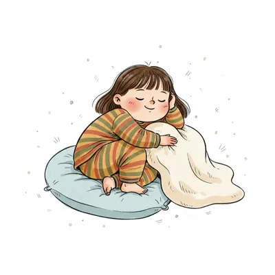 Friedliches Mädchen umarmt Lamm auf Kissen, mit einer kleinen Regenwolke über dem Kopf.