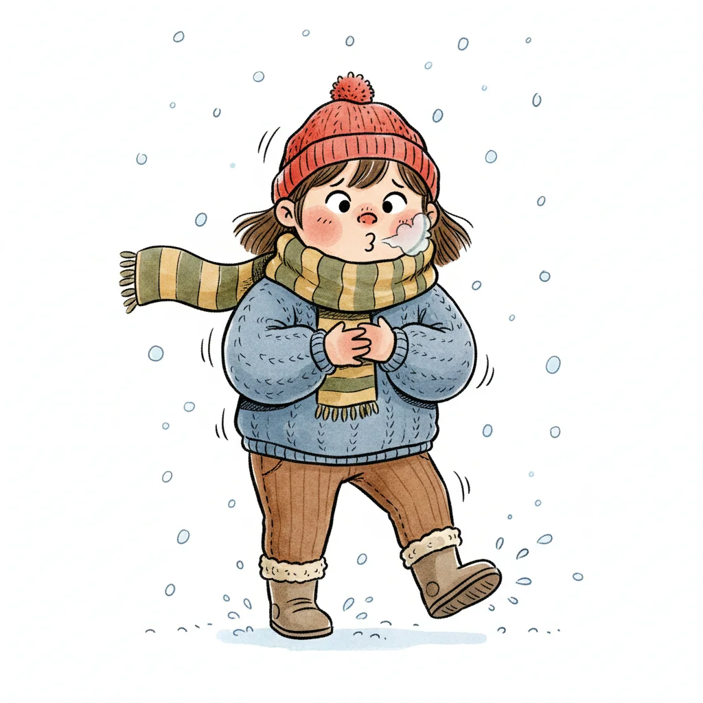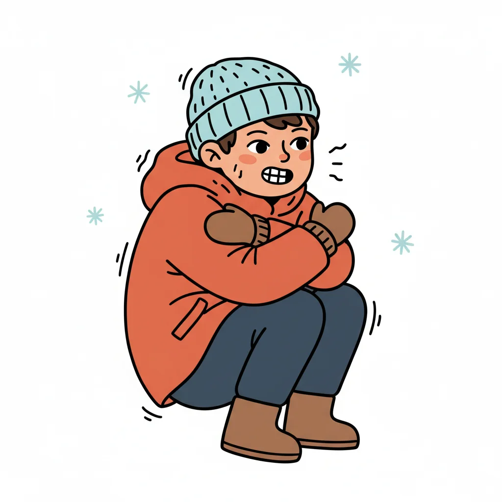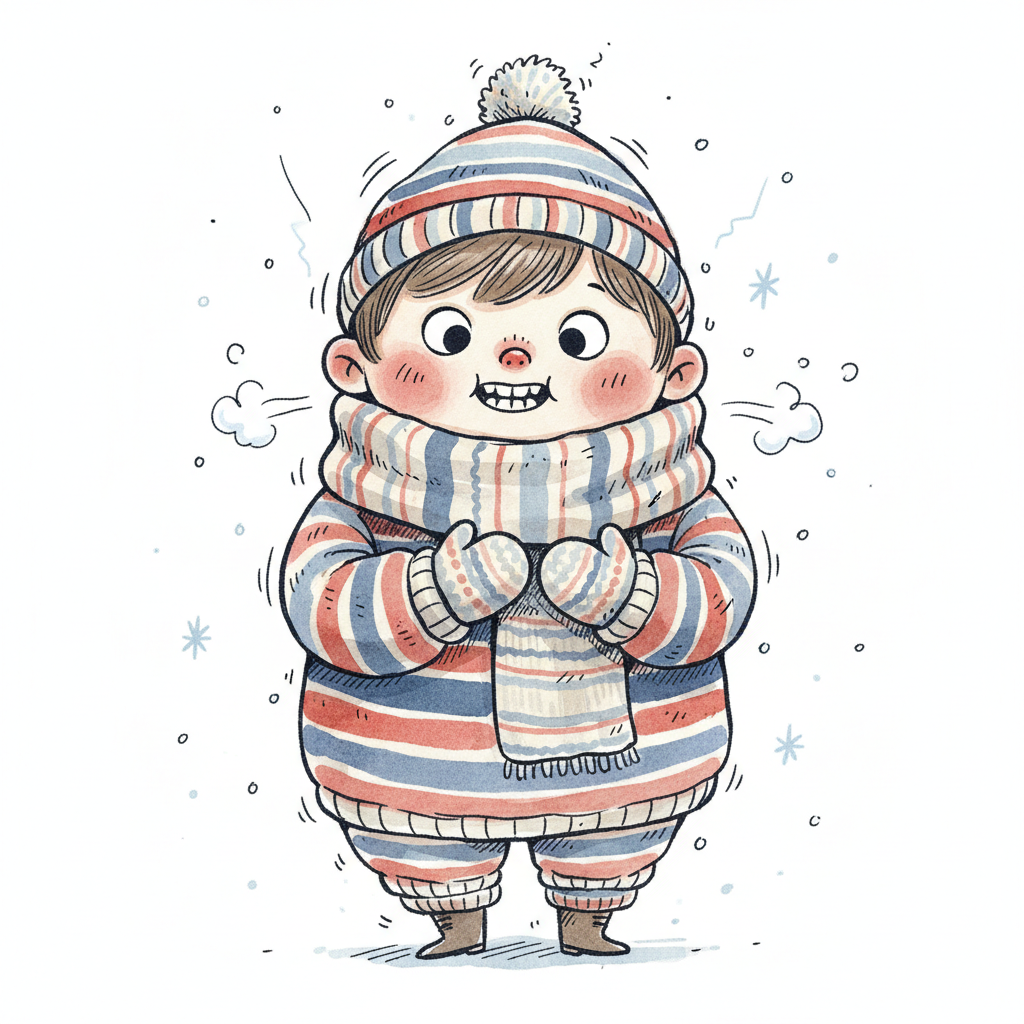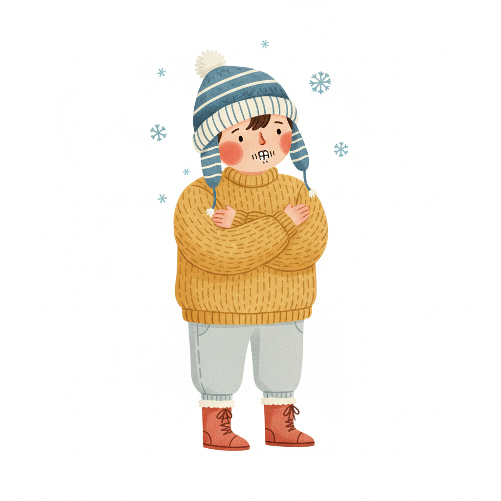 Cartoon-Junge in Mütze und Pullover friert, umgeben von eisigen Wirbeln.
