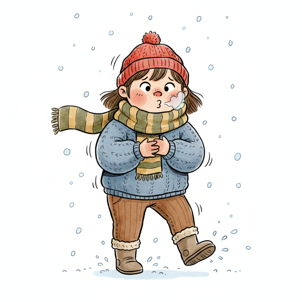 Ein frierendes Kind im Winteroutfit mit Mütze und Schal, umgeben von Schneeflocken.