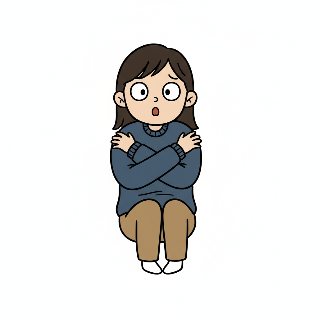 Cartoon-Mädchen mit großen Augen, das sich ängstlich oder frierend umarmt und hockt.