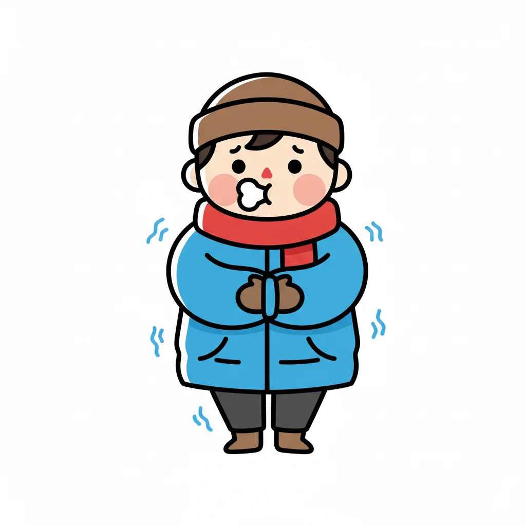 Illustrierte Person in Winterkleidung friert, Dampf aus dem Mund, zitternd.