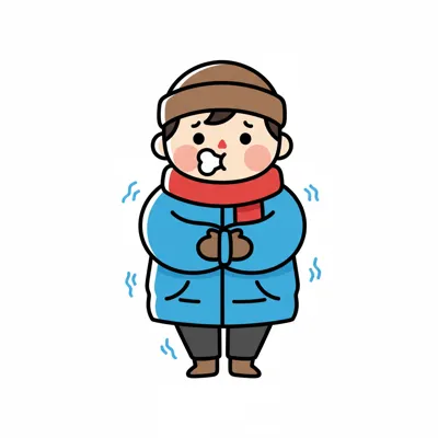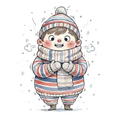 Cartoon einer frierenden Person in Winterkleidung mit Mütze und Jacke, die im Schnee zittert.