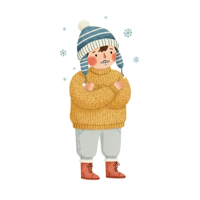 Illustration einer frierenden Person in Winterkleidung mit Mütze und Handschuhen, umgeben von Schnee.