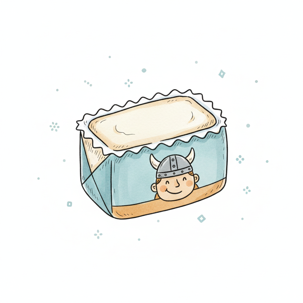 Eine witzige Zeichnung von einem Kuchen mit einem Viking-Gesicht.