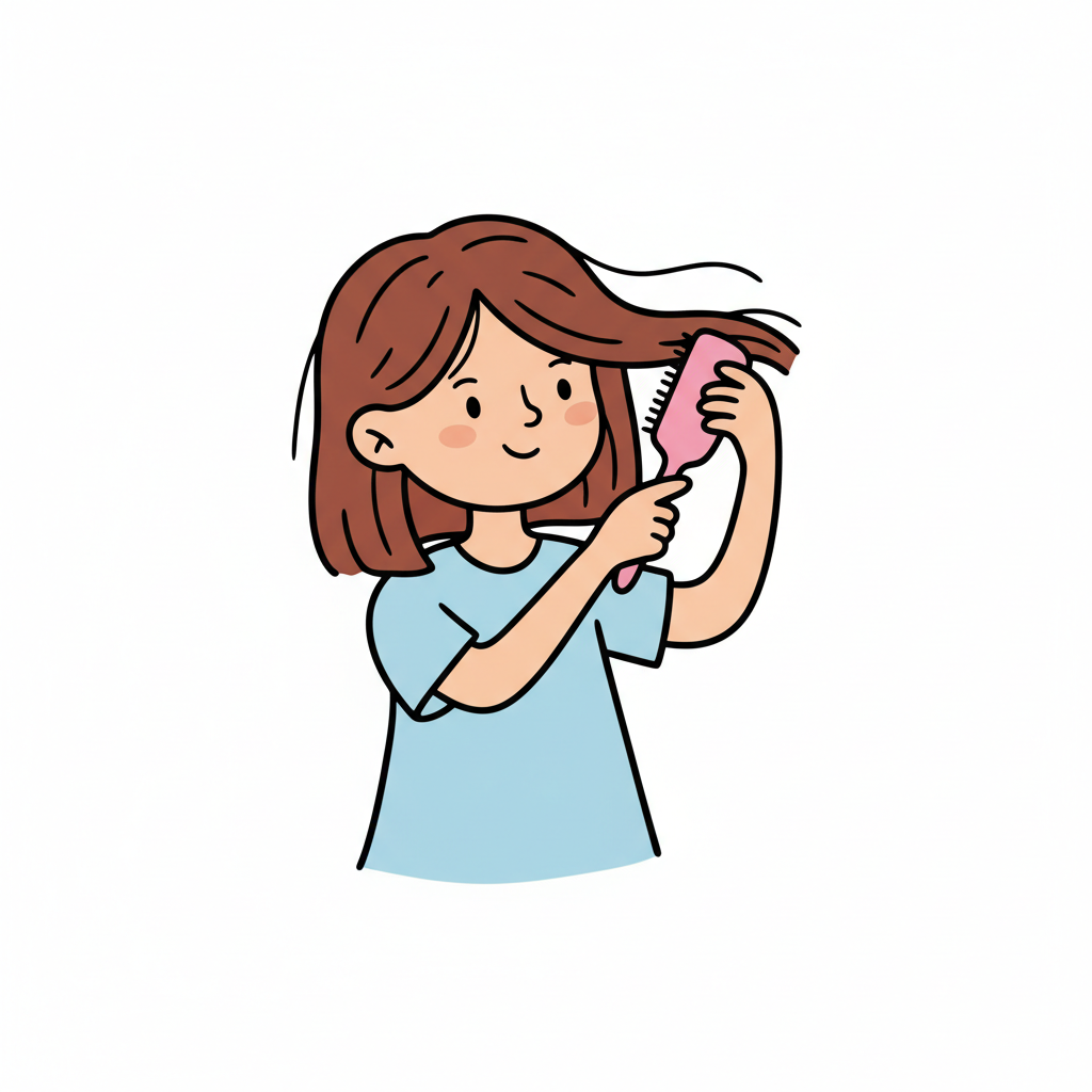 Ein Mädchen kämmt ihr Haar mit einem rosa Kamm.