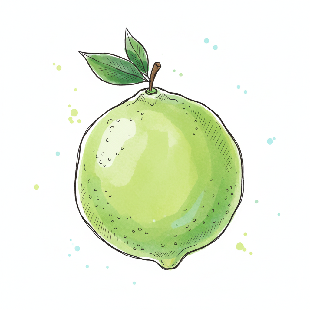 Eine grüne Zitrone mit einem Blatt und bunten Spritzern im Hintergrund.