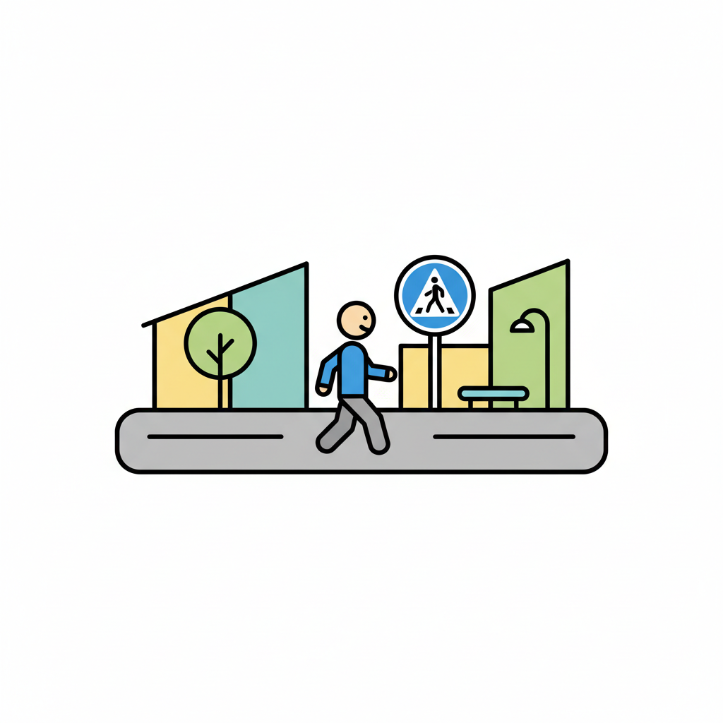 Stilisierte Darstellung eines Fußgängers auf einem Bürgersteig mit Zebrastreifen-Schild und Stadtkulisse.